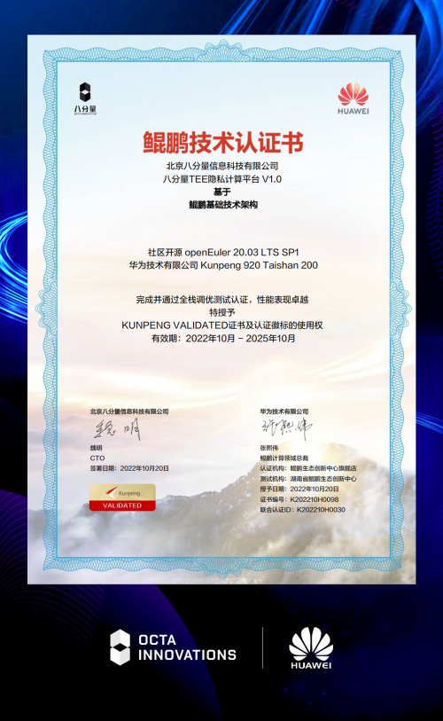 最新的消息是,近日,八分量TEE隐私计算平台V1.0基于鲲鹏基础技术架构通过全栈调优测试认证,并且性能表现卓越,获得由华为技术有限公司颁发的KUNPENG VALIDATED证书及认证徽标的使用权。