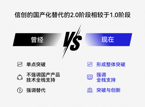在媒体、社交平台等领域,“信创”“国产化替代”非常常见的一类词汇,不少人将两者混淆。在海比研究院、中国软件行业协会、中国软件网三方联合发布的《2022中国信创生态市场研究及选型评估报告》看来,信创的本质是国产化替代的2.0阶段。相较于曾经的1.0阶段,信创有三点不同:曾经是单点突破,现在是把点进行串联,形成整体突破;曾经不强调国产产品技术全栈支持,现在强调全栈支持,实现生态建设;曾经强调替代,现在不仅是替代,还要有技术或应用上的突破与创新。