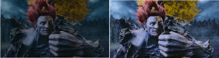 基于高动态范围的特性,《刺杀小说家》HDR Vivid版呈现出更丰富的画面层次和更多的暗部细节。“这是因为在HDR Vivid技术下,随着动态范围的提升,调色空间也随之变大,所以才能更好地区分暗部层次。”张亘介绍。此外,HDR Vivid版中还同步展现出了更多微小的细节。例如赤发鬼的眼神光和毛发反光变得更亮。由此一来,角色造型立体感更强,对于叙事和画面美学而言都有很大帮助。