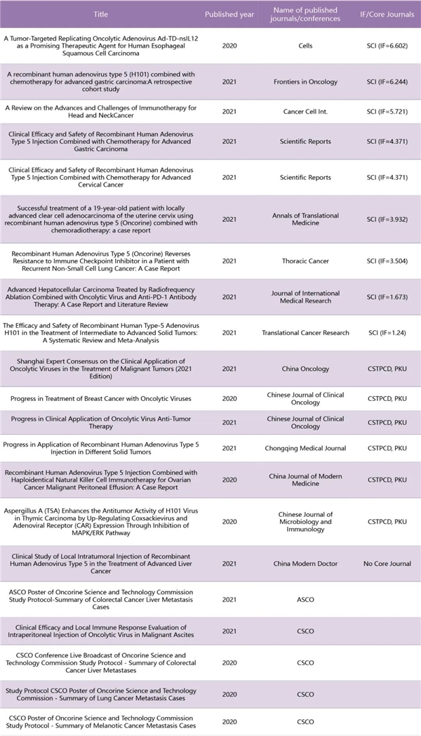 《替雷利珠单抗联合重组人5型腺病毒注射液治疗既往免疫治疗失败的晚期NSCLC患者:一项探索性单臂研究》、《重组5型腺病毒联合FOLFOX方案肝动脉灌注化疗(HAIC)术治疗肿块型肝内胆管癌的一项单中心、单臂、前瞻性研究》、《重组人5型腺病毒注射液对索拉非尼治疗后疾病稳定的晚期肝癌患者的疗效及安全性:一项前瞻性、随机、平行对照临床研究》、《重组人5型腺病毒注射液联合新辅助化疗用于术前III期肺癌的前瞻性、随机对照临床研究》和《溶瘤病毒H101联合卡瑞利珠单抗治疗复发宫颈癌的疗效评估及获益人群筛选》项目也已被2022年CSCO大会接收。