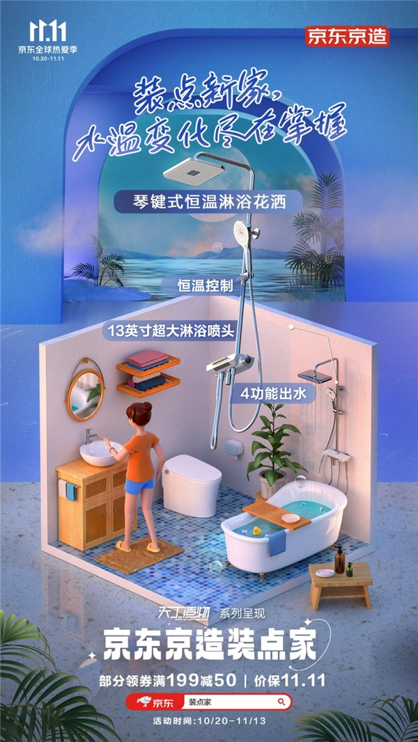 其中,卫浴空间作为使用率最高、最需要用心规划的家居空间,不仅承担着重要的清洁功能,更是放松身心的一隅之地。为此,京东京造推出琴键智能恒温淋浴花洒、小白鲸W智能马桶等产品,以"细节控"的态度、无微不至的关怀,为消费者构建了一个更有品质的家。