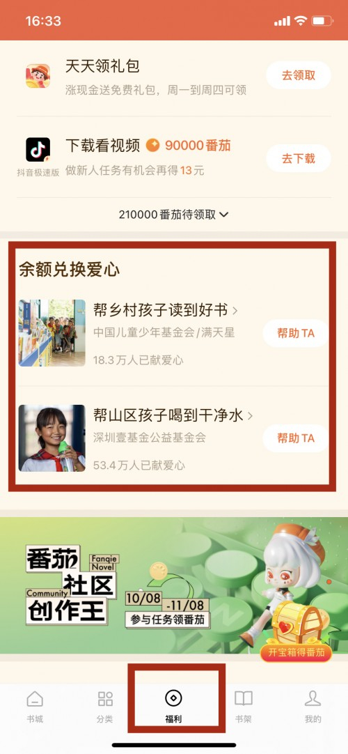 作为计划的发起者,番茄小说邀请用户通过视频广告、签到、读书等多种路径兑换金币,参与到公益活动中来。番茄小说会将读者捐赠的金币转化为赠款,捐助给山区儿童。用户可以打开番茄小说APP-点击底部「福利」页面、同时,也可以通过提现页面的【爱心捐助】入口进入-下拉页面至「余额兑换爱心」即可进行捐赠。