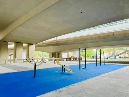 北星桥下体育场分布在运河两岸,上方是留石快速路高架,改造后的桥下体育场总面积达到1400平方米,包含新建的篮球场、门球场和若干健身设施,还有300平方米的空间,铺设了地砖,可以作为广场舞的场地。
