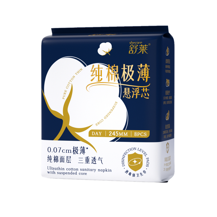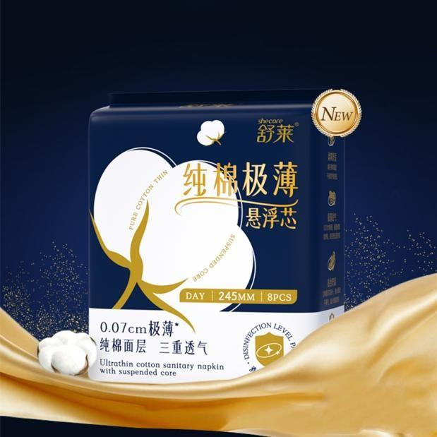 纯棉极薄悬浮芯卫生巾 以100%纯棉+0.07cm极薄+消毒级+抗菌+立体悬浮芯设计,主打纯棉极薄、更柔软舒适,能更好呵护敏感肌;