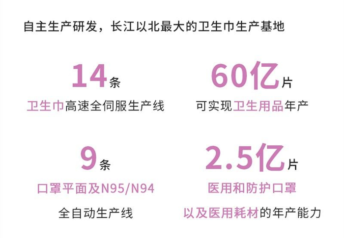 作为老牌国货品牌,舒莱一直把产品质量放在首位,自主生产研发,品牌规模不断发展壮大。目前舒莱拥有长江以北最大的卫生巾生产基地,生产基地总投资6.7亿元,占地面积169亩,建设有卫生巾生产车间、十万级净化车间、中国科学院联合实验室等。其中卫生巾高速全伺服生产线就有14条,口罩平面及N95/N94全自动生产线9条,能实现年产60亿片系列卫生用品和具备年产2.5亿片医用和防护口罩以及医用耗材的生产能力。