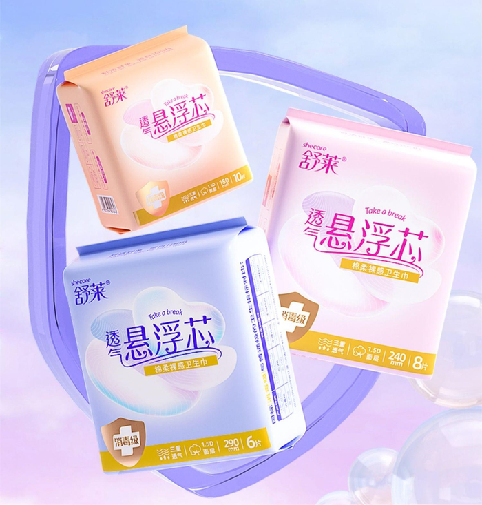透气悬浮芯卫生巾 以消毒级+抗菌+立体悬浮芯设计,主打更透气更安全,能减少细菌滋生和异味不适;