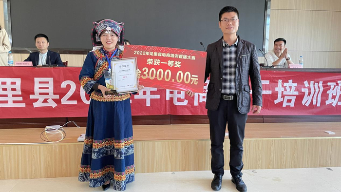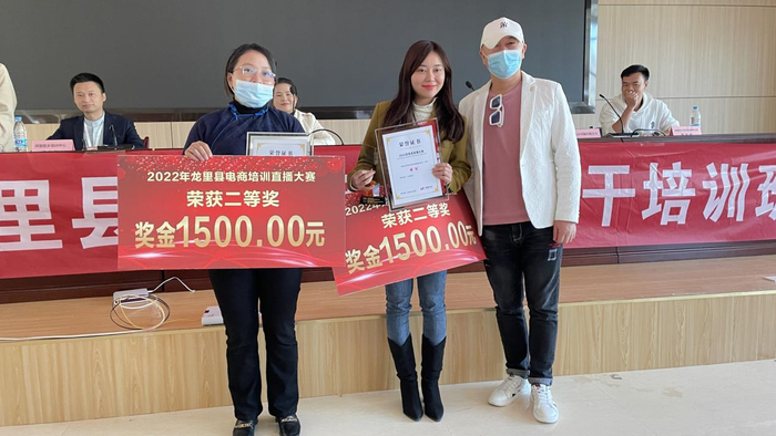 “老张”张群同学、“刺梨西施”韦娟同学也以优异的表现获得亚军,龙里县乡村振兴局主任陈俊为她们颁发了奖励。