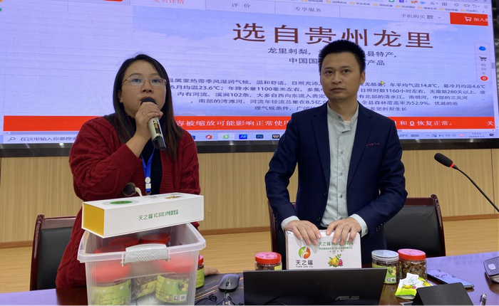 11月1日线下课堂上,阿里数乡的老师们为大家做好了赛前选品的准备,来自本地的商家们纷纷上台带着自己的产品进行卖点介绍。本次直播样品均为本地农特产品,分别有贵州豫紫腾萱食品有限公司生产的“刘二孃旺角油辣椒”和贵州叁合农业发展有限公司提供的“天之福”刺梨原液、果干、果脯等系列产品,以及贵州云禾智慧电子商务有限公司提供的刺梨鲜花饼、刺梨冻等十余款本地特色农产品。