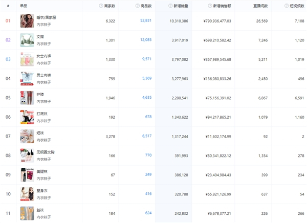 从有米有数新电商营销大数据分析平台上可以看出,近30天抖音电商家居服饰赛道热卖单品,“睡衣/居家服”最畅销;进一步对比单品数据发现,“睡衣/居家服”单品在商家数、商品数、直播间数、短视频数几个关键数据中,都远超位于第二名的“文胸”。