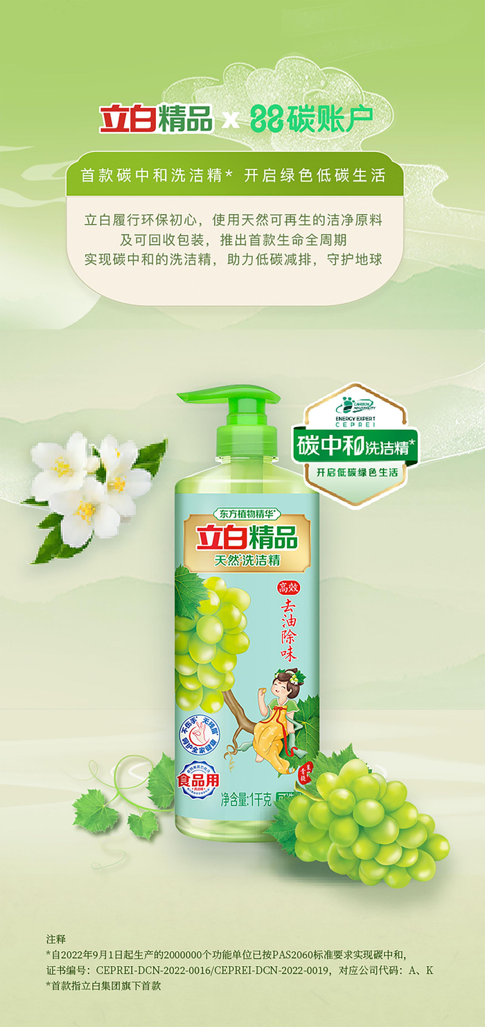 在天猫“绿色”会场中,立白科技集团也推出了首个“碳中和洗洁精”——立白精品青提茉莉洗洁精,这款通过使用天然可再生植物洁净原料,创新升级混溶工艺降低能耗,同时采用可回收包装,成为立白首款从“摇篮到大门”生命周期实现碳中和的洗洁精,用低碳产品和行动助力低碳减排,开启低碳绿色生活,加速日化行业向碳中和迈进的进程。