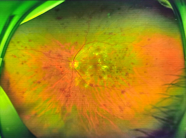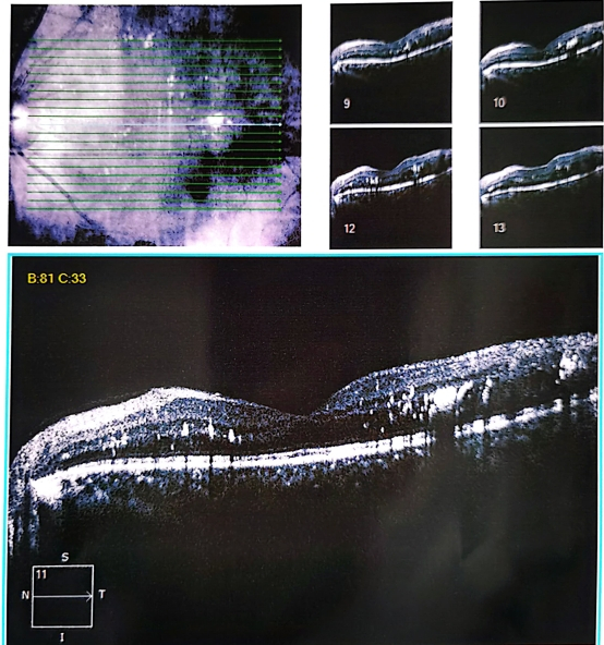 上图为苏先生左眼的眼底照片,他来就诊的时候原本是拒绝检查左眼的,因为左眼视力0.8,而且自觉没有任何异常。在张思伟主任的坚持下,苏先生做了眼底照相,拿到眼底图和OCT检查后,经过诊断苏先生的左眼已经达到糖网3期的诊断标准,如果不进行治疗很快就会和右眼一样出血甚至失明。