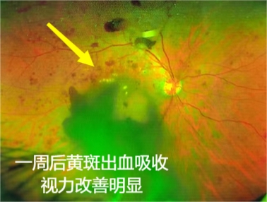 苏先生的出血时间较长,张思伟主任与苏先生沟通后,尝试通过消融激光打开玻璃体后界膜,释放出网膜前积血。一周后,苏先生再次就诊,视力恢复到了0.12。经过检查,他眼底的出血吸收了近一半,治疗效果非常理想。张思伟主任介绍:苏先生的右眼原本必须通过玻璃体切除手术才可以改善视力、控制病情,但是这次我们通过尝试用激光消融释放了网膜前积血,可以暂缓手术,同时尽快的完成全视网膜激光光凝,控制病情的进一步恶化。消融激光治疗糖尿病眼底出血我们已有不少成功案例,也为此类视网膜前出血的患者提供了一个新的治疗手段。