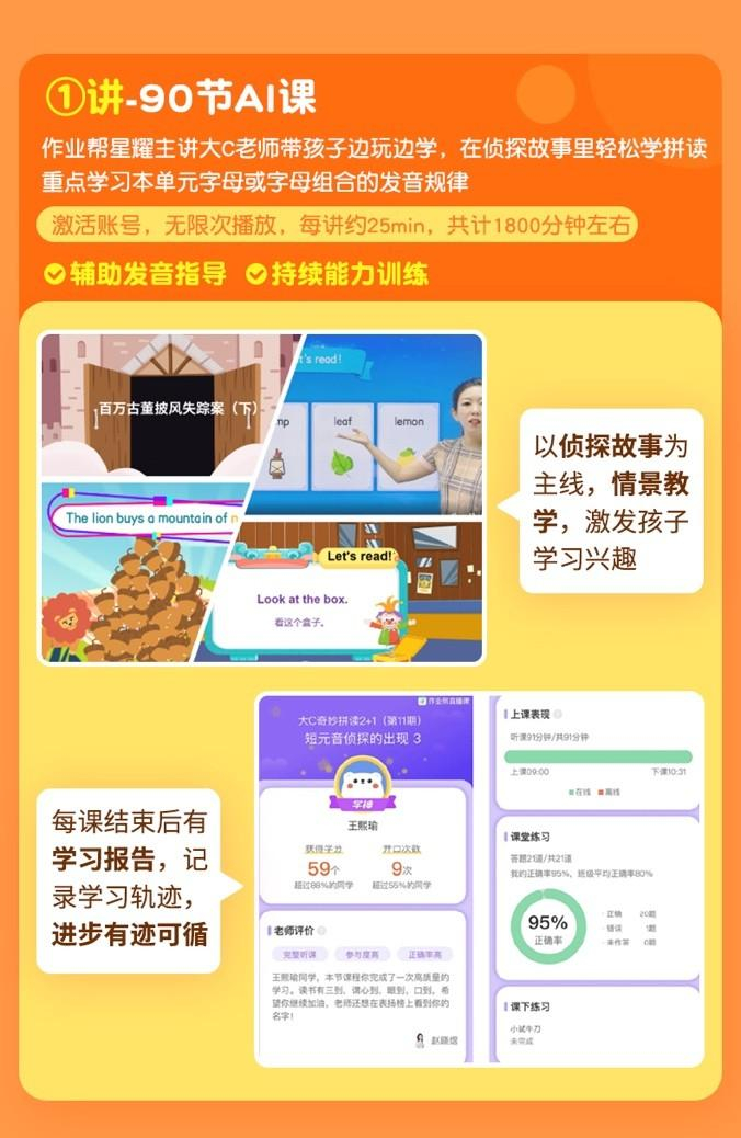 爸妈不用担心没时间教、没能力教,学习效果不理想!孩子的碎片化时间能有效利用起来,《帮帮英语》内含超过1800分钟的智能AI课,每节课25分钟左右,睡前磨耳朵、早起练晨读,让孩子从0到1,边学边练,零基础的孩子也不怕。拥有超过10年英语教学经验的大C老师手把手教孩子,在侦探故事里轻松学拼读,边玩边学,让孩子轻松掌握发音规律。