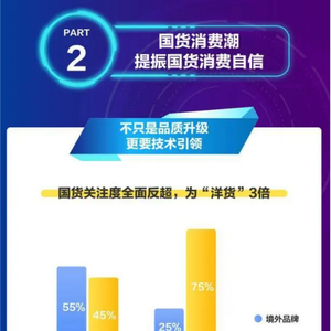 另外,来自天猫的数据显示,今年天猫双11开售1小时,就有102个品牌成交额过亿元,其中国货品牌占比过半数。据京东数据显示,预售4小时,京东累计售出商品超5.5亿件,成交额前20的品牌中,国产品牌占比达80%。种种数据都在讲述着同一个事情——无论是在品牌、文化,还是科技领域,全面自信的国货已经逐渐超越甚至碾压外资品牌。