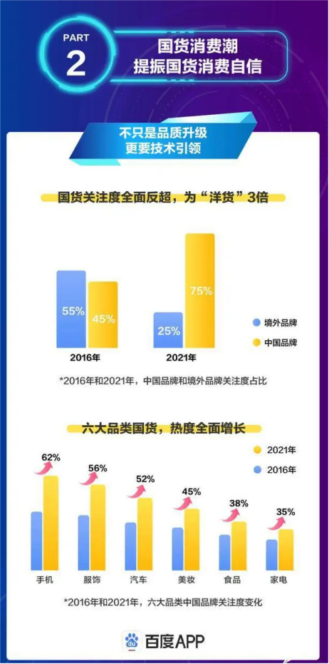 据百度《国潮搜索大数据》报告,近5年中国品牌热度占比从45%提升到75%,是“洋货"的三倍,无论是科技产品、大众消费品,还是配件类产品,国人选择国货的热度持续增高。