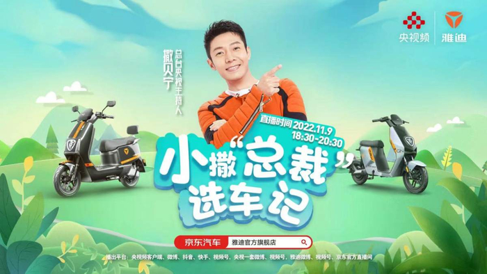 近日,全球电动两轮车第一品牌雅迪联动多个科技、娱乐大咖发布了趣味十足的双11预告视频,雅迪智能人工助手“小迪”与总台央视主持人撒贝宁(以下简称“撒贝宁”)心动连线,要为在2021年晋升为雅迪“名誉总裁”的撒贝宁挑选一个得力帮手,消息一经发出,便迅速刷爆了所有“骑士”的朋友圈,引发全网热议。
