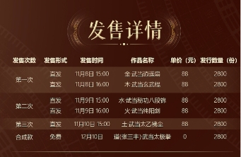 据悉,11月8日至10日,上述五款数字藏品将在“央数藏”平台正式上线,每款限量发行2800份。其中《金·武当逍遥扇》和《木·武当玄武棍》将于11月8日下午15时和16时分别上线,《水·武当秘功八段锦》和《火·武当纯阳剑》将于11月9日下午15时和16时分别上线,《土·武当太乙拂尘》将于11月10日下午15时上线。用户可下载央视影音App,进入首页或“我的”页面,点击“央数藏”进行收藏。
