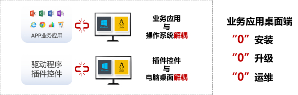 APPV云应用通过虚拟化技术解除业务软件与Windows操作系统间的强绑定关系,让用户在UOS/KOS桌面直接运行IE浏览器/Wintel业务系统,使用原有打印机、U-Key、高拍仪,保留用户熟悉的使用体验,更进一步带来业务应用桌面端“0”安装“0”升级“0”运维的高效管理能力,实现应用“软切换” 。