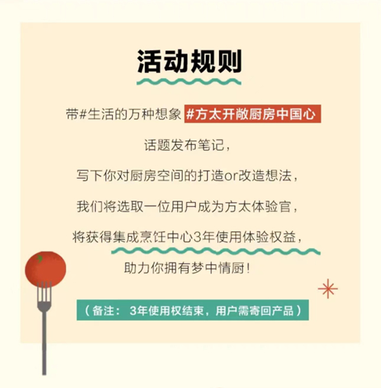 在「生活的万种想象2.0」活动期间,带上话题词#生活的万种想象 #方太开敞厨房中国心 发布笔记,即有机会被方太翻牌成为品牌体验官,获得集成烹饪中心产品的3年使用体验权益。不论是已经完成的厨房空间打造笔记,还是改造心得,亦或是你对于未来餐厨空间的生活想象,都可以在笔记里尽情分享。也许,下一秒小红书就会和方太一起助你拥有自己的梦中情厨!