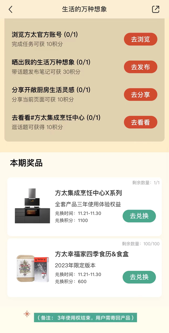 此外,大家还可以搜索活动话题完成品牌任务获得积分,兑换由方太提供的大牌福利,让自己与理想中的家更近一步。