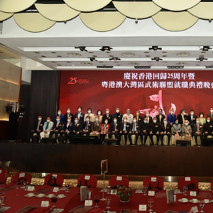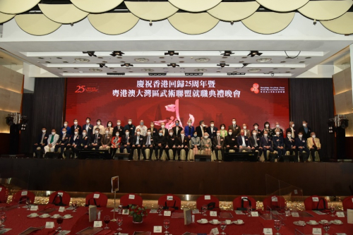 香港作为中外文化艺术交流中心,“粤港澳大湾区武术联盟”特意选址香港于11月5日举行“庆祝香港回归25周年暨粤港澳大湾区武术联盟就职典礼晚会”。出席的主礼及嘉宾包括: 中国人民政治协商会议第十三届全国委员会副主席梁振英先生、中华人民共和国香港特别行政区行政会议非官守议员召集人叶刘淑仪女士、中华人民共和国香港特别行政区文化体育局及旅游局副局长刘震先生、中华人民共和国香港特别行政区基本法委员会前副主任梁爱诗博士、中国香港体育协会暨奥林匹克委员会会长霍震霆先生、中华人民共和国香港特别行政区立法会议员(体育、演艺、文化及出版界) 霍启刚先生、以及中华人民共和国香港特别行政区立法会议员(选举委员会)马逢国先生。“庆祝香港回归25周年暨粤港澳大湾区武术联盟就职典礼晚会”是一项庆祝香港特别行政区成立25周年的认可活动。