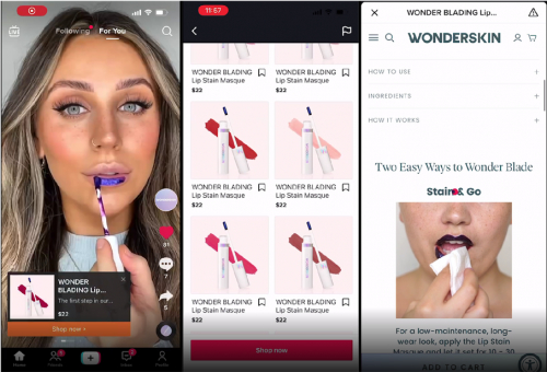 以美妆品牌Wonderskin为例,通过Video Shopping Ads (for Catalog) 推广一款“不褪色”唇膏单品,以化妆教程式视频广告有效地将潜在客户吸引至其线上商城,并且配合使用Video Shopping Ads的产品卡片和动态落地页,使得产品卡片直接在信息流广告中展现其产品,当用户点击按钮时,用户可通过动态落地页功能,跳转到系统自动生成的商品列表页,浏览丰富的商品。每个商品列表页均由系统根据用户兴趣个性化生成。