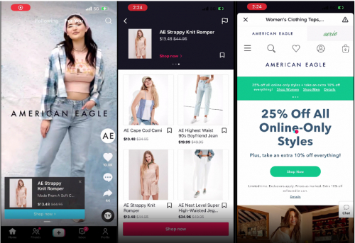 美国服装零售商American Eagle使用了Video Shopping Ads (for Catalog)的Dynamic Format(动态创意)功能,可根据用户购买意向向用户推荐不同类型的视频创意。同时American Eagle还通过API完成了前期的对接,从其网站目录中选择各种产品,并利用动态落地页,根据用户的购买意向自动创建更符合用户兴趣的商品列表页,推动商品售卖。