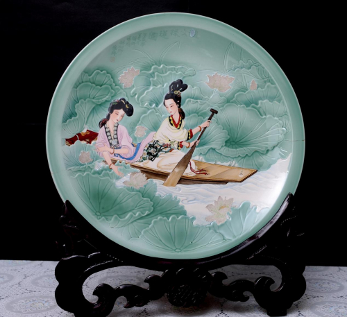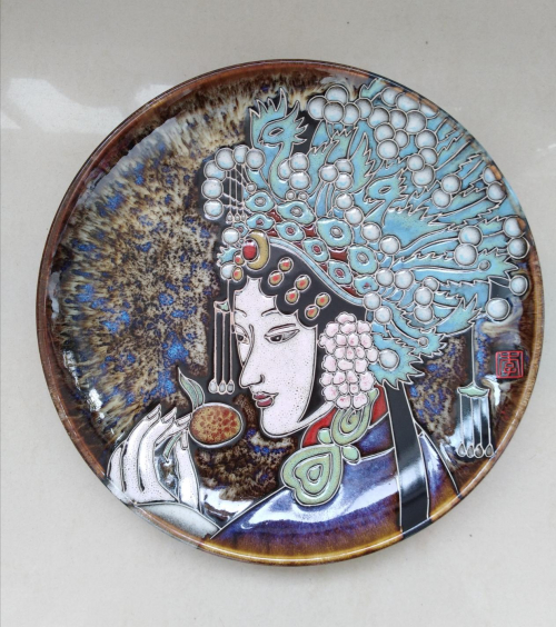 2017年釉下彩2时盘《散花图》荣获“神龙杯山东省工艺美术创意奖“金奖”