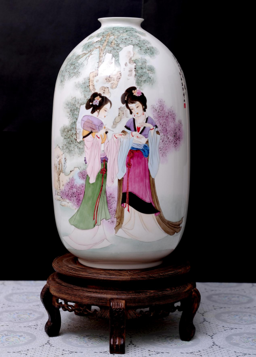 代表作品创作设计的仕女物有名著《红楼梦》的《十二金钗》、《红楼四春》,中国《四大数》、《四大妆》以及神话故事中的《七仙女下凡》、《嫦娥奔月》、《洛神》,兰闺群芳中的《清秋望月》、《玉栏红叶》、《帝里春晓水》。瓷板画系列的《唐宫伎乐图》,还有大量的花卉作品,如《富贵满堂》《富贵白頭》《前程似锦》等等。