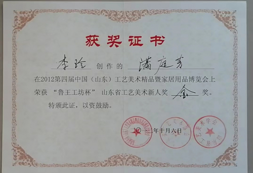 2012年如意瓶《满庭芳》荣获“鲁王工坊杯”、山东工艺美术新人奖“金奖”