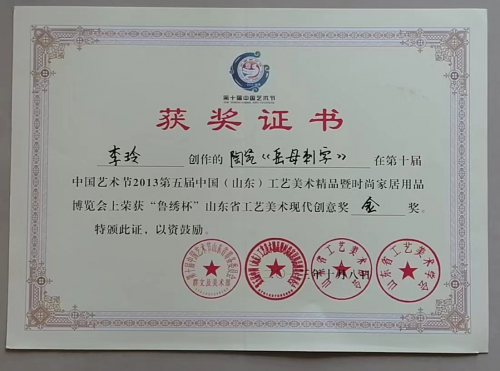 2013年陶瓷瓶《岳母刺字》荣获"鲁秀标”山东工艺美术现代创意奖“金奖”