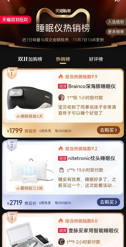 蝉联天猫品类热销榜首的睡眠新品