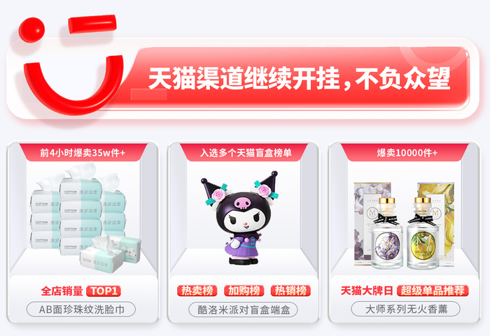 从产品来看,热卖的产品都有一个共同点:花钱不多,但均具备一定的“治愈力”,可以让生活变得更精致,或者缓解压力,舒缓心情。从双11战报来看,名创优品此次双11治愈系好物深受年轻人的青睐,出现了许多爆款。如天猫旗舰店的AB面珍珠纹洗脸巾、酷洛米派对盲盒端盒、大师系列无火香薰等。其中,AB面珍珠纹洗脸巾在天猫旗舰店前4小时热销超35万件,酷洛米派对盲盒端盒入选多个天猫盲盒榜单,大师系列无火香薰爆卖超10000件,坐姿草莓熊公仔更是凭借萌趣造型火出了圈……