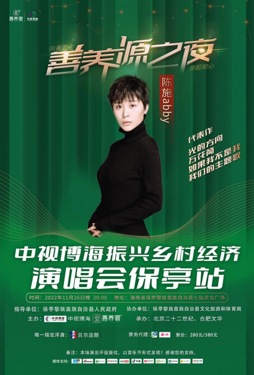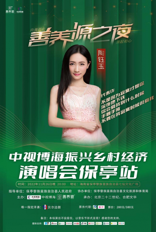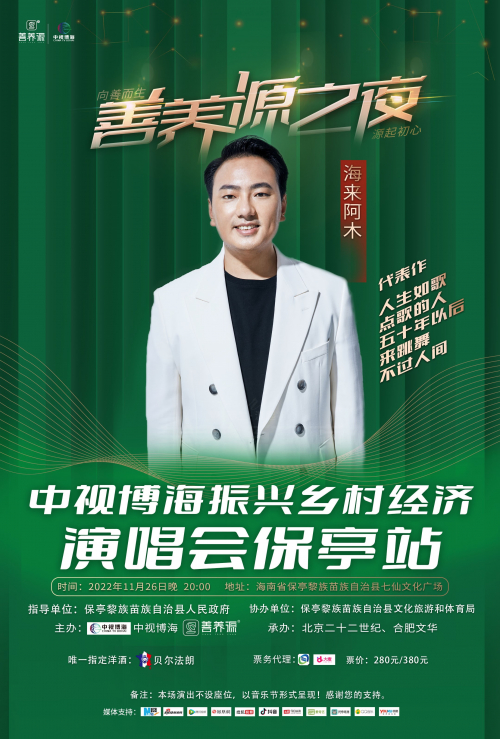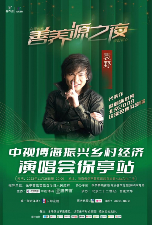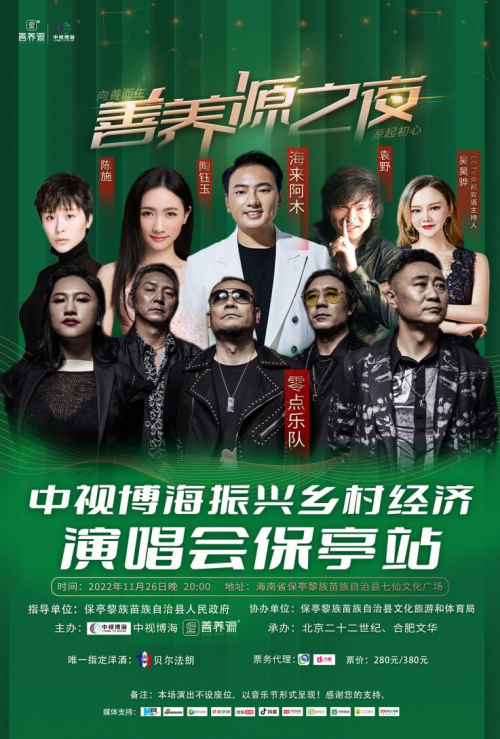 好粥好状态·善养源之夜《中视博海振兴乡村经济》演唱会保亭站即将于11月26日在海南省保亭开唱,海来阿木、零点乐队、袁野、陶钰玉、陈施、吴昊骅等一众实力歌手将与您相约保亭现场!