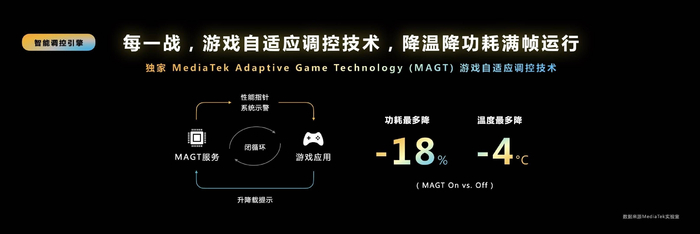 除了让玩家兴奋的移动光追技术,联发科还发布了自家的游戏自适应调控技术,可降低高帧率游戏的功耗和终端设备的温度,最高可降低18%的游戏功耗,让满帧运行更持久。从联发科本次的发布会可以了解到,《王者荣耀》作为该技术的首个战略合作伙伴,双方团队共同探索并打造了终端设备与游戏自适应的先进科技。通过高效的MAGT架构,《王者荣耀》系统可以根据终端硬件的实时负载情况,动态调整游戏的渲染逻辑,带来更好的极致画质满帧和稳帧体验,让游戏续航更持久。