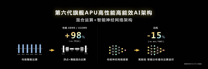高能效AI架构同样是天玑旗舰芯的杀手锏之一,集成的MediaTek第六代AI处理器APU,高能效AI架构不仅较上一代提升了35%的AI性能,还可大幅降低各类AI应用的功耗。