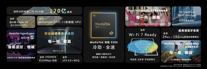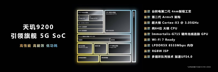 从发布会公布的产品信息看,天玑9200旗舰配置拉满,CPU、GPU、APU和内存、闪存支持的规格都是满血级。