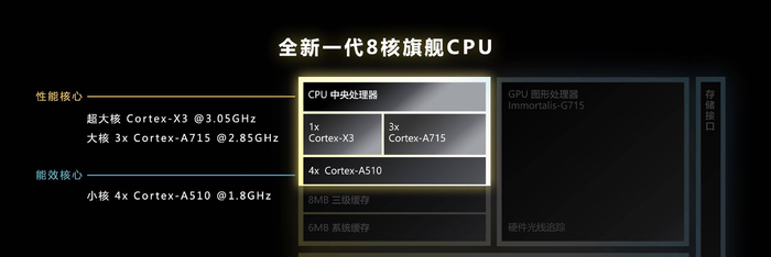 天玑9200采用台积电第二代4nm工艺和第二代Armv9架构,为顶级性能和能效表现保驾护航。CPU方面,天玑9200搭载八核旗舰CPU,包括1个主频高达3.05GHz的Cortex-X3超大核,3个2.85GHz主频的Cortex-A715大核,以及4个1.8GHz主频的Cortex-A510小核,并且性能核心全部支持纯64位应用,业界领先。
