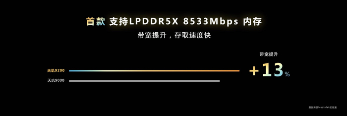联发科天玑9200支持LPDDR5X 8533Mbps内存和8通道UFS4.0闪存,利用多循环队列技术让数据传输再次提速。