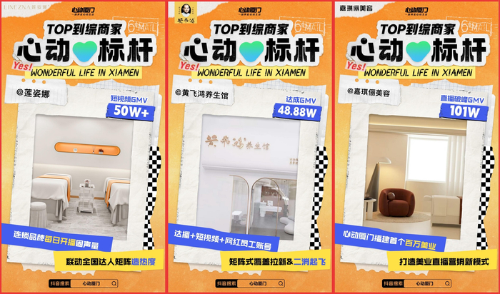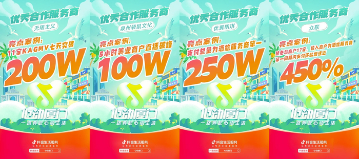 本次“心动厦门”活动中,众多抖音生活服务服务商积极投身加入,从线上传播、亮点活动打造等方面入手,为活动带动了明显的营销增长。