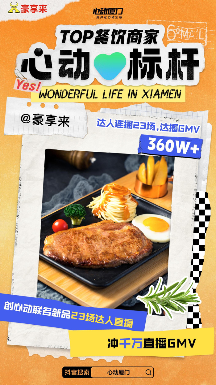 豪享来是创建于1993年的中国餐饮连锁品牌,秉持「好牛排,中国味」的理念及严苛的品质标准,做中国人爱吃的好牛排。去年12月,豪享来入驻抖音生活服务,通过与全国各地的达人合作短视频探店和直播带货,用高性价比的团购套餐快速打入市场,带动品牌曝光和大量新客,单月GMV超千万,真正实现「品效合一」。