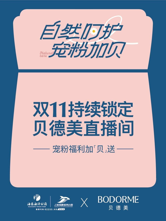 根据主办方消息,活动期间在上海海昌海洋公园的虎鲸剧场、微信、微博、小红书等众多平台都可以看到贝德美花样宠粉的海报。11月1日,贝德美在抖音直播间进行了“自然呵护 加贝宠粉”的主题直播,实力宠粉,上海海昌海洋公园门票和周边送不停,惊喜连连。此外,11月8日,贝德美还将在上海海昌海洋公园水下应援,宠粉加“贝”。
