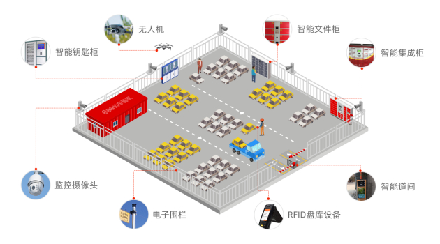 运车管家所有中心仓已全部完成智能化改造,智能仓内安装了智能道闸、全封闭电子围栏和多路无死角视频监控。每一台车进入仓库前都会被分配RFID标签,使其全程可以被数字化监管。所有车辆出入库都需要识别认证,一旦出现异常情况,就会自动触发报警,从而保障库内资产的安全。”