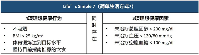 2010年美国心脏协会(AHA)首次颁布了理想心血管健康指南——“Life’sSimple 7”(简单生活方式7)。通过这7项指标,改善饮食和生活习惯,从而达到理想的心血管健康。Life'sSimple 7包括4项可干预的行为特征(吸烟、饮食、体力运动和体重指数)和3项可干预的生物学特征(血压、总胆固醇和空腹血糖)。详见下表。