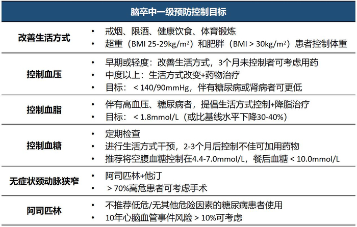 脑卒中一级预防包括改善生活方式、控制血压、控制血脂、控制血糖、干预无症状颈动脉狭窄、使用阿司匹林等。具体控制目标见下表。