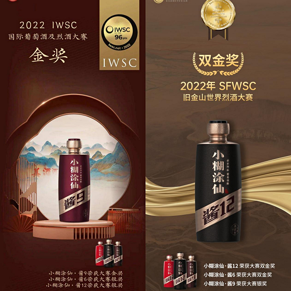 值得注意的是,在酿造产区、原料、工艺的三方优势之下,小糊涂仙也仍然在不断的调整中提质升级,致力于为消费者带来更高品质的产品。在今年年初,小糊涂仙酒业集团举行了产品焕新升级发布会,对于酱酒系列的外观设计与口感进行全面焕新提升,升级后的产品也获得了国内、国际的高度认可。在2022年国际葡萄酒及烈酒大奖赛(简称:IWSC)和旧金山世界烈酒大赛(简称:SFWSC)上,小糊涂仙酒业集团选送参加的三大系列八款产品全部获奖。其中,酱酒系列更是在比赛上大放异彩,在两个大赛上一共斩获两项“双金奖”、一项金奖和三项银奖的好成绩。酱酒系列的每一款产品都受到国际专业品鉴专家的高度肯定与好评,比如在IWSC评选中,小糊涂仙酱9不仅摘得金奖,而且获得了专家团高度赞美:“ 初品香气丰富而馥郁强烈,余味甘甜而令人回味,是一场味蕾盛宴,一款值得珍藏的美酒。”