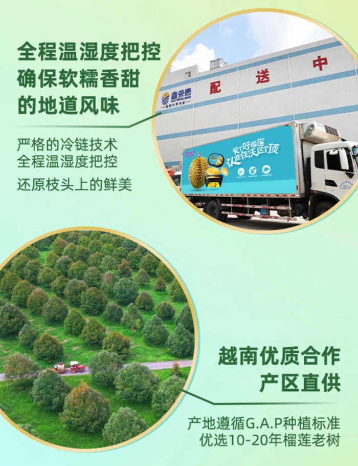 为解决这一难题,京东超市深入越南产地,围绕榴莲新鲜度、甜度、品种、规格、外观等多个方面制定了严格的采摘标准,并派专员进驻产地,现场监督榴莲的采购、加工、发货、质检全流程。同时,京东超市还充分利用平台成熟的冷链物流能力,将榴莲从越南到国内流通的整个环节进行贯通,实现效能提升,减少损耗。