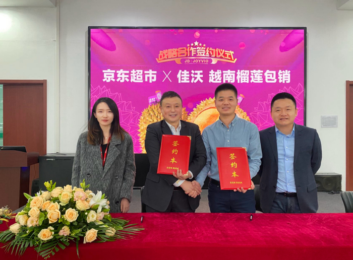 11月8日,京东超市联合鑫荣懋果业科技集团股份有限公司举行了“京东超市佳沃越南榴莲包销签约仪式”。这意味着京东超市也成为越南榴莲国内独家首发、线上包销重要渠道。