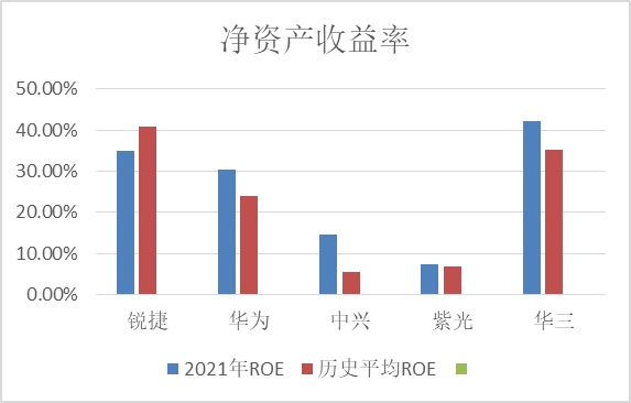 三、净资产收益率(ROE)高于行业平均水平: 锐捷网络2021年加权平均净资产收益率为34.88%,过去11年(2010年至2021年)的平均值为40.78%;同业中:华为2021年ROE为30.53%,过去11年的平均值为24%;紫光股份2021年ROE为7.36%,近5年平均值为6.73%,旗下子公司新华三2021年ROE为42.19%,过去5年平均值为35.24%;中兴2021年ROE为14.49%,近11年平均值为5.59%。