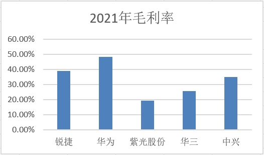 二、主营业务毛利率高于同业平均水平: 锐捷网络近三年(2019年、2020年、2021年)主营业务毛利率分别为:45.93%、39.24%、39.01%(2020、2021年受产品结构调整和疫情影响,毛利水平下滑,但2022年上半年毛利率回升至40.31%)。同业中,中兴通讯2021年毛利率35%,紫光股份2021年毛利率19.52%(新华三毛利率约为25.67%),华为近三年(2019年、2020年、2021年)主营业务毛利率分别为:37.6%、36.7%、48.3%(2021年华为剥离了荣耀、服务器等毛利率低的业务,所以拉高了自身毛利率水平)。
